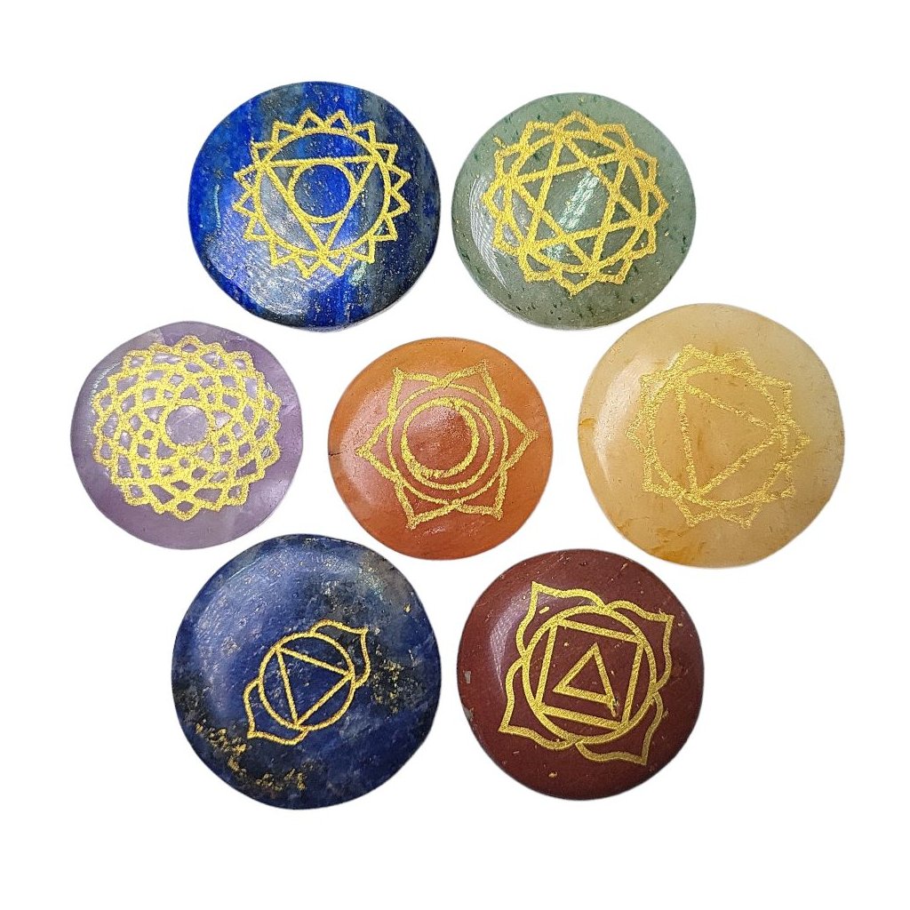 Sada obsahuje 7 kameňov v podobe okrúhlych placiek, zodpovedajúcich 7 základným čakrám. Každý kameň je brúsený do okrúhleho tvaru a zdobený ručne vyrytými symbolmi pre jednotlivé čakry. Cieľom sady je dosiahnutie rovnováhy a dobíjanie energie siedmich základných čakier v tele. Čakry sú energetické centrá, ktoré podporujú fyzické a emocionálne zdravie.