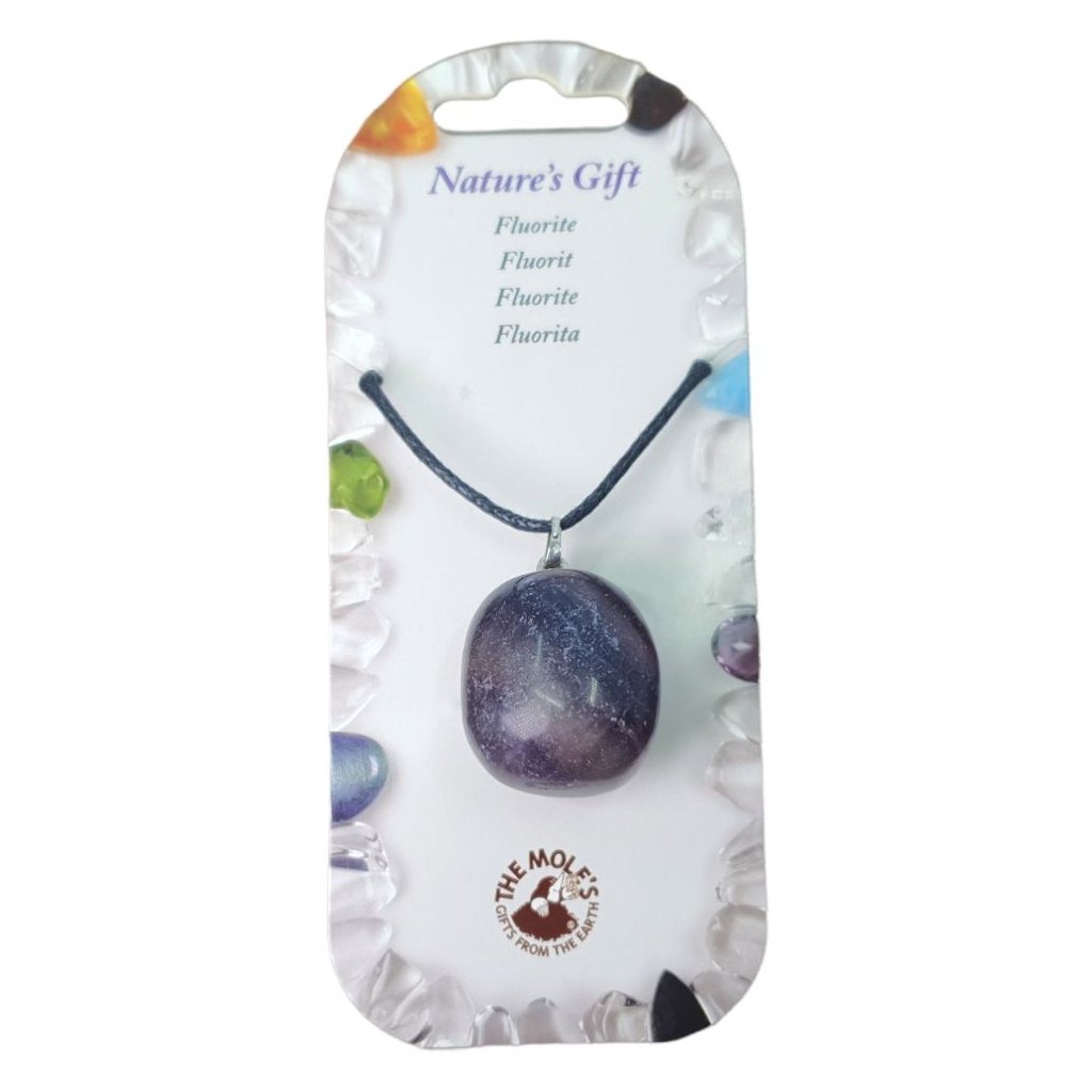 Náhrdelník fluorit kameň tromlovaný na čiernej látkovej šnúrke. Fluorit je kryštál obdarený silnou ochrannou mocou, najmä na duševnej úrovni. Pomôže rozoznať, kedy sa vo vašom vnútri snažia prejaviť cudzie vplyvy. Súčasne dokáže zastaviť pôsobenie psychickej manipulácie a nevhodného duševného vplyvu.