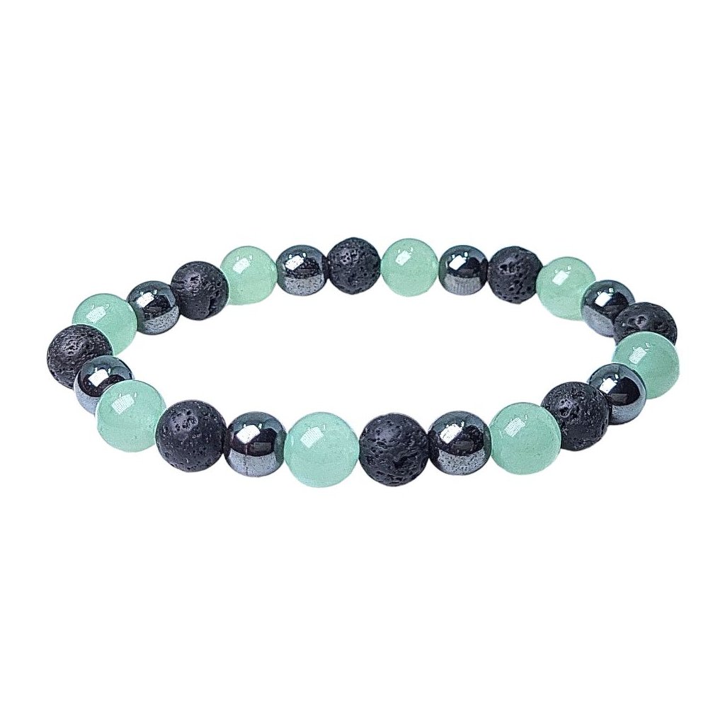 Náramok zložený z lávového kameň, hematitu a zeleného aventurínu. Lávový kameň je bohatý na minerály a na liečivé vibrácie, obsahuje zemskú aj ohnivú energiu, ktorá vás udrží uzemnených a pripravených zažiariť. Tento kameň má v skutočnosti nesmierne upokojujúcu energiu. Hematit prináša nám vnútorný kľud a pocit tepla, bezpečia a ochrany Matky Zeme. Rieši magnetické bloky okolo nás. Aventurín zelený podporuje rozhodnosť, vytrvalosť, kreativitu a vnímanie. Priťahuje prosperitu a šťastie.