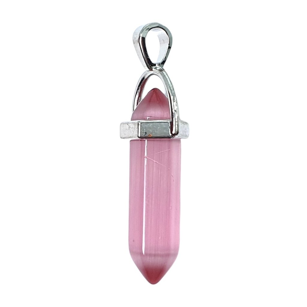 Prívesok mačacie oko rúžové v tvare ceruzky. Mačacie oko sa odleskuje ako záblesk mačacieho oka v noci. Mačacie oko je výnimočným polodrahokam. Je kameňom šťastia a úspechu. Chráni nás pred nebezpečenstvom, pred neznámymi nepriateľmi. Nositeľovi celkovo napomáha pri koncentrácii, v abstraktom myslení a precíznom vnímaní.
