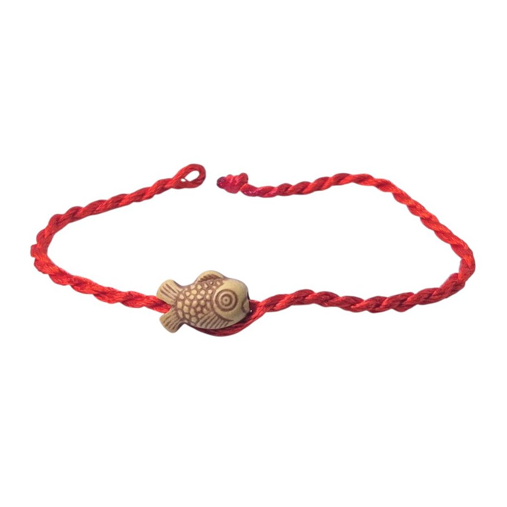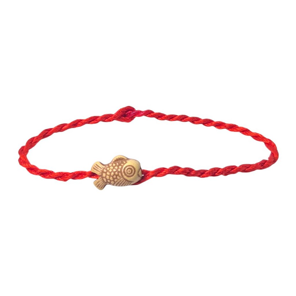 Tento tradičný červený náramok z pevnej šnúrky má jednoduché, ale účinné zapínanie: na jednom konci uzlík, na druhom malá slučka, cez ktorú sa uzlík prevlečie – náramok tak ľahko prispôsobíte zápästiu. V strede náramku rybka v tvare kapra, symbol bohatstva, vytrvalosti a splnených prianí.