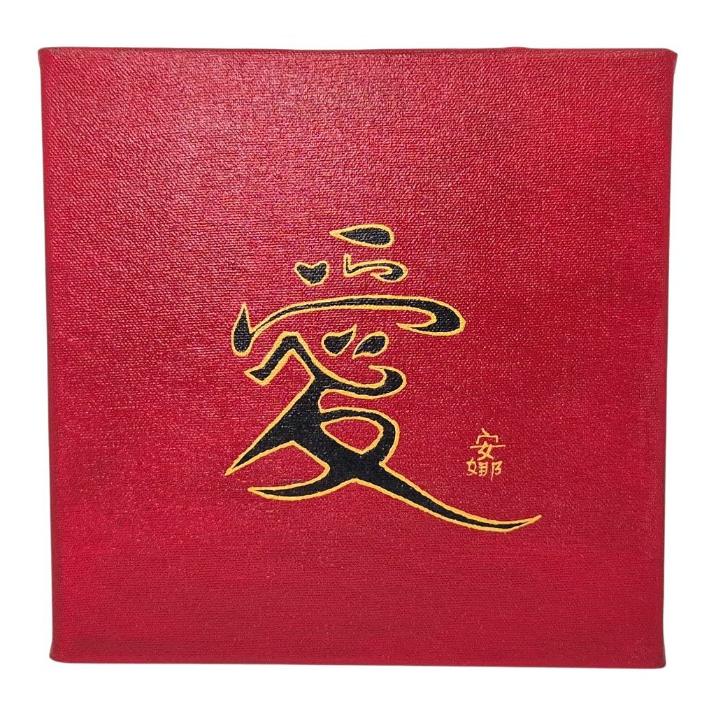Ručne maľovaný obraz tradičnej kaligrafie „Láska“ – symbolu harmónie, nežnosti a otvoreného srdca. Maľba je vytvorená akrylovými farbami na eko plátne napnutom na drevenom ráme v rozmere 20 × 20 cm a dopĺňa ju elegantný zlatý obrys. Ideálny feng shui doplnok do spálne, obývačky alebo ako darček so silným významom.