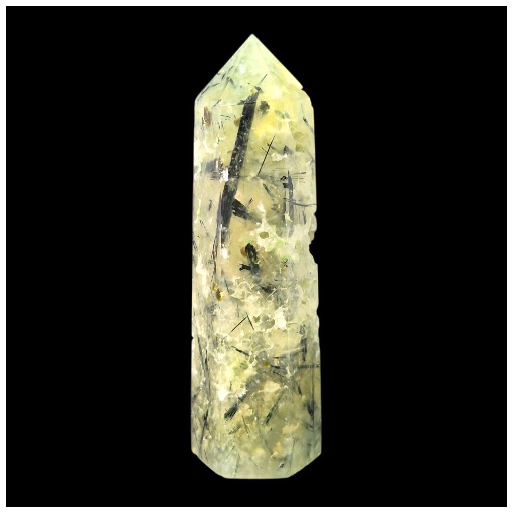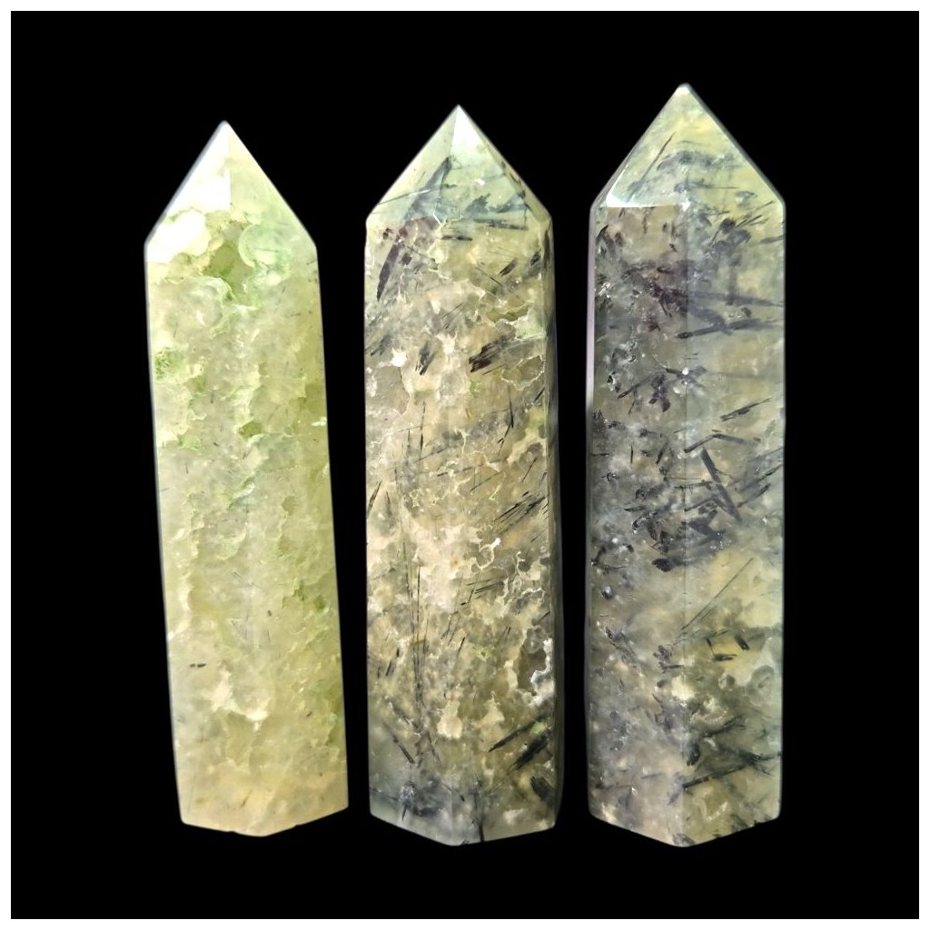 Každý špic je originálny prírodný kus, s jemne priehľadnou zelenou farbou, v ktorej sa lesknú tmavé vlákna turmalínu alebo epidotu. Táto kombinácia dodáva kameňu výnimočný vzhľad a posilňuje jeho ochranné účinky.