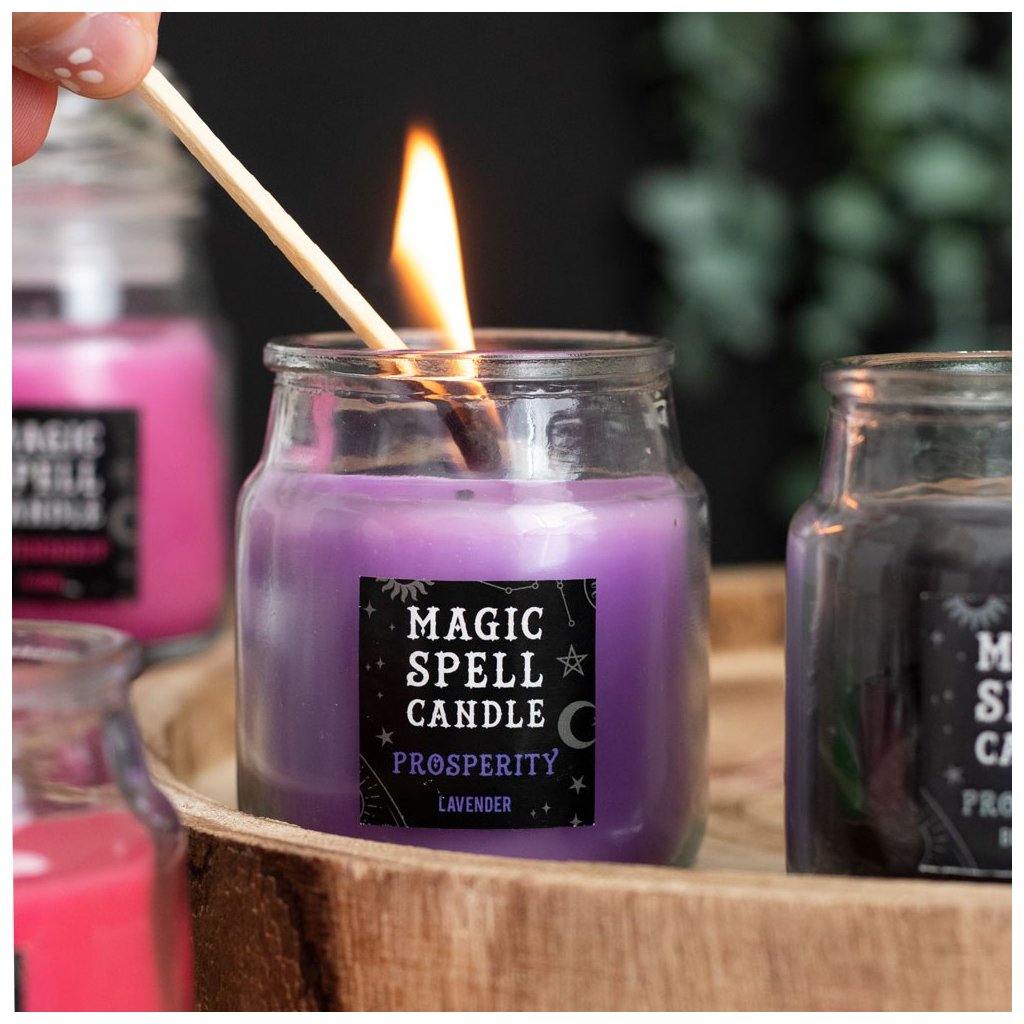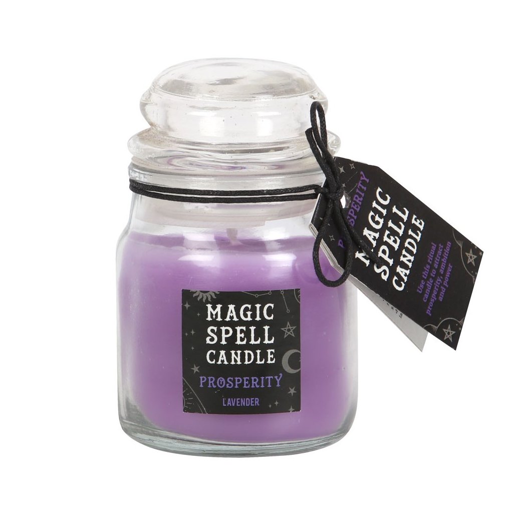 Sviečka - Levanduľa „Prosperita“ od Magic spell. Magická sviečka na prilákanie prosperity a hojnosti. Fialová farba symbolizuje duchovnú silu a transformáciu, zatiaľ čo levanduľová vôňa prináša harmóniu a upokojenie.