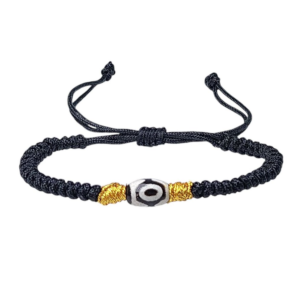 Tibetský náramok DZI čierny pletený, pomáha pri dosahovaní vnútorného pokoja, posilňuje sebadôveru a priťahuje hojnosť. Tento mystický náramok je tiež talizmanom pre zlepšenie kariéry, úspechu a osobného rozvoja, čím napomáha nositeľovi na jeho ceste k naplneniu a duchovnému rastu.