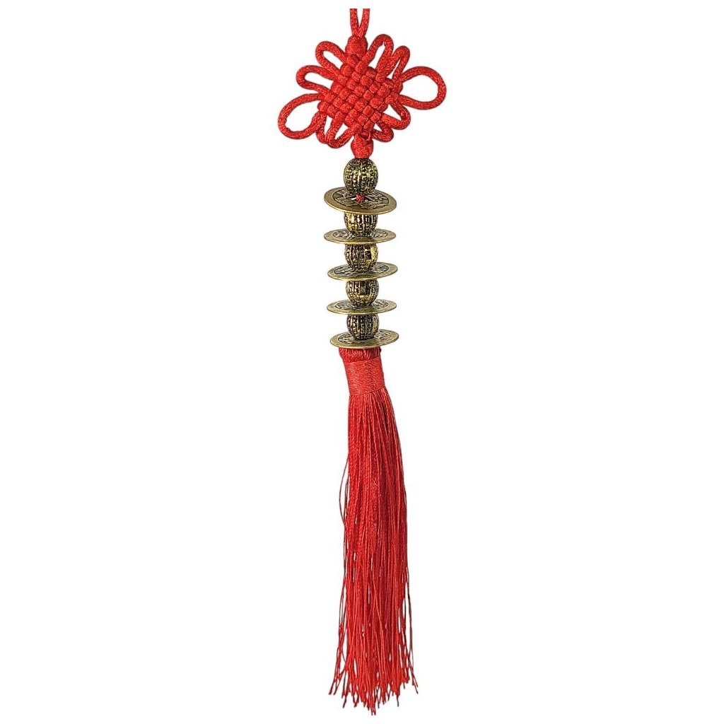Krásny záves piatich čínskych minci v tvare pagody s nekonečným uzlom a bohatým strapcom. Päť mincí je na ochranu pred nebezpečenstvom a škodou, ako aj na prilákanie šťastia. Päť mincí tiež znamená päť prvkov vo feng šuej (kov, drevo, voda, oheň a zem) pre vyvážený a harmonický život. Mince sú zviazané červenou šnúrkou a mystickým uzlom, ktorý posilňuje ich energiu .